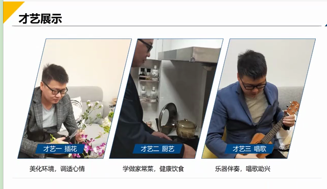 宅男宅女健身秀以及才艺万花筒两个活动均以小视频的形式参与。参加的老师通过精心制作个人创意视频,包括强身健体的跳绳、亲子活动等健身秀视频,还有美食厨艺、插花花艺、诗词朗诵、乐器演奏等,充分展现老师们多才多艺的一面和健康宅家、积极乐观的生活态度。