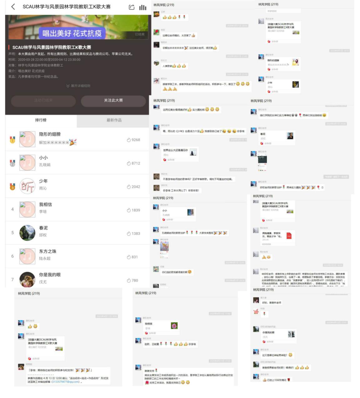 “唱出美好”在线K歌大赛吸引了众多多才多艺的老师们共同参与,尽情地一展歌喉,唱出美好心情,唱出幸福生活。在比赛中,老师们选的曲目也大多是“阳光总在风雨后”、“我相信”、“隐形的翅膀”等正能量爆棚的歌曲,教职工们用歌声表达着抗击疫情的信心和希望疫情的阴霾赶紧消散的愿望。“唱歌有助于身心健康,有助于陶冶情操,有助于忘却烦恼,舒缓情绪。”“感谢学院工会,感谢学院老师积极组织这样有意义的活动,积极参与一下。”“必须积极响应学院工会活动,谢谢工会老师的准备和创意。”学院各位老师对本次K歌大赛充分肯定,不但积极参与进行演唱,更加在群里相互打气,不断互动点赞。