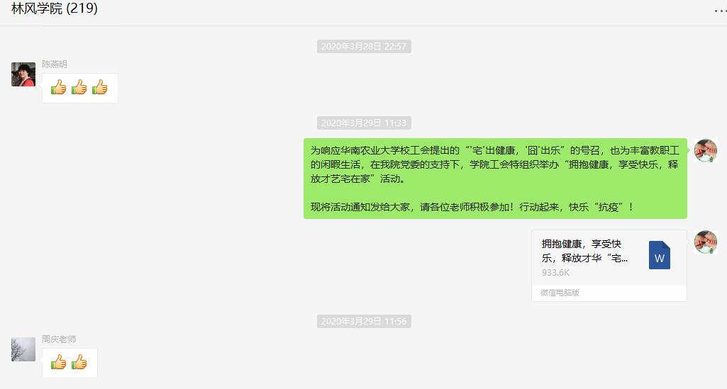 为进一步丰富疫情防控期间学院教职工的业余生活,帮助教职工调节和缓解“抗疫”的身心压力,促进家人、同事间的互动,提高教职工的幸福指数,共同营造乐观、积极、向上、和谐的工作和生活氛围。3月份以来,学院工会积极响应校工会提出的“‘宅’出健康,‘囧’出乐”主题活动,在学院党委的大力支持下,成功举办“拥抱健康,享受快乐,释放才华宅在家”系列在线文体活动。