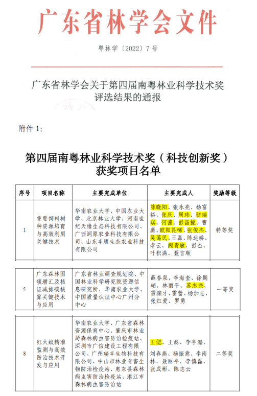 近日,广东省林学会发布了《关于第四届南粤林业科学技术奖评选结果的通报》(粤林学[2022]7号),由我院陈晓阳教授团队主持申报的科研成果“重要饲料树种资源培育与高效利用关键技术”获得第四届南粤林业科学技术奖(科技创新奖)特等奖,王偲教授主持获得二等奖,苏志尧教授参与获得一等奖。