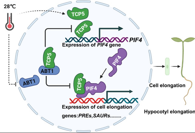 WRKY14的氨基酸序列与ABT2/WRKY35、ABT3/WRKY65和ABT4/WRKY69的氨基酸序列高度相似并属于系统发育树中的同一进化支,这些WRKY的功能均未知。过量表达ABT2/WRKY35、ABT3/WRKY65或ABT4/WRKY69的转基因株系均表现出和abt1-D类似对高温不敏感的表型。通过构建多重突变体,发现abt1 abt2 abt3 abt4四重突变体表现出与abt1-D相反的表型,对高温更敏感,下胚轴更长;进一步通过酵母双杂交、荧光素酶互补和Co-IP等实验证明了ABT1可以与TCP5、TCP13和TCP17相互作用;通过一系列生化实验,研究者揭示了ABT1调控植物热形态建成的分子机制,即ABT1和TCP5的相互作用,一方面抑制了TCP5对PIF4转录的激活,另一方面通过与PIF4争抢TCP5抑制了PIF4-TCP5转录激活复合体的活性,从而精细调控PIF4的转录激活活性和植物对高温的反应。研究者还通过一系列的遗传互作实验证明了ABT1确实与热形态建成的正调控因子PIF4、TCP5和BZR1具有相反的作用。