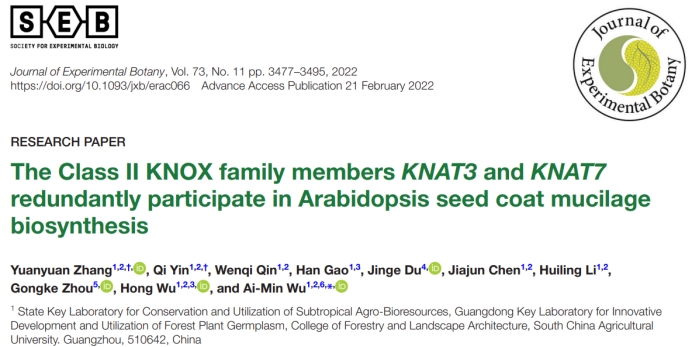 在Journal of Experimental Botany上发表了 “The Class II KNOX family members KNAT3 and KNAT7 redundantly participate in Arabidopsis seed coat mucilage biosynthesis”的研究论文。该研究报道了II类KNOX亚家族成员KNAT3和KNAT7正调控拟南芥种子的粘液质生物合成,其功能缺失导致种子粘液质产生和柱状层形成缺陷。