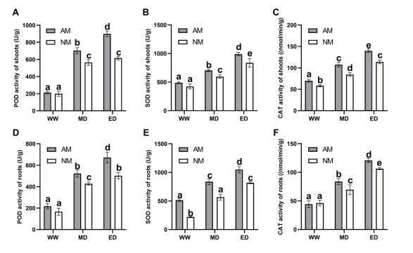图2. 干旱胁迫下接种AM真菌对巨桉抗氧化酶活性的影响