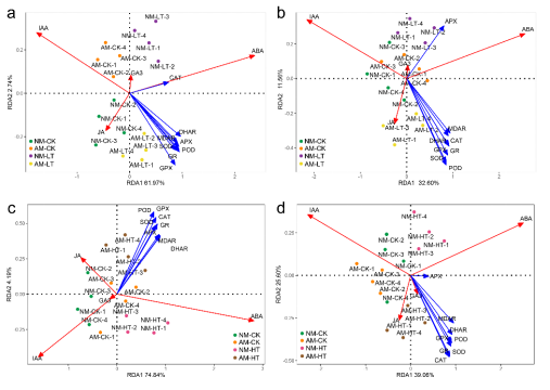 同时,唐明、陈辉教授团队针对华南地区夏季高温和冬季低温制约多年生黑麦草产业发展的关键因素,系统研究了AM真菌在高温和低温胁迫下对多年生黑麦草光合能力、抗氧化酶活性、非酶抗氧化剂和内源激素含量的影响,阐明AM真菌对抗氧化酶编码基因和内源性激素相关基因表达的调控作用,揭示菌根化多年生黑麦草对高温/低温耐受性的机制。