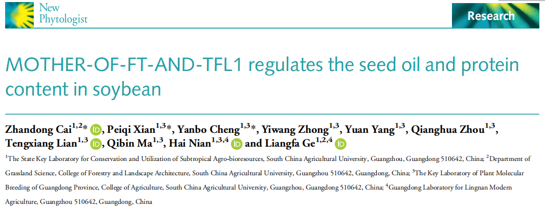 近日,我校59859cc威尼斯官网葛良法教授和农学院年海教授合作在国际著名杂志New Phytologist发表题为“MOTHER-OF-FT-AND-TFL1 regulates the seed oil and protein content in soybean”的研究论文(论文链接为https://doi.org/10.1111/nph.18792)。