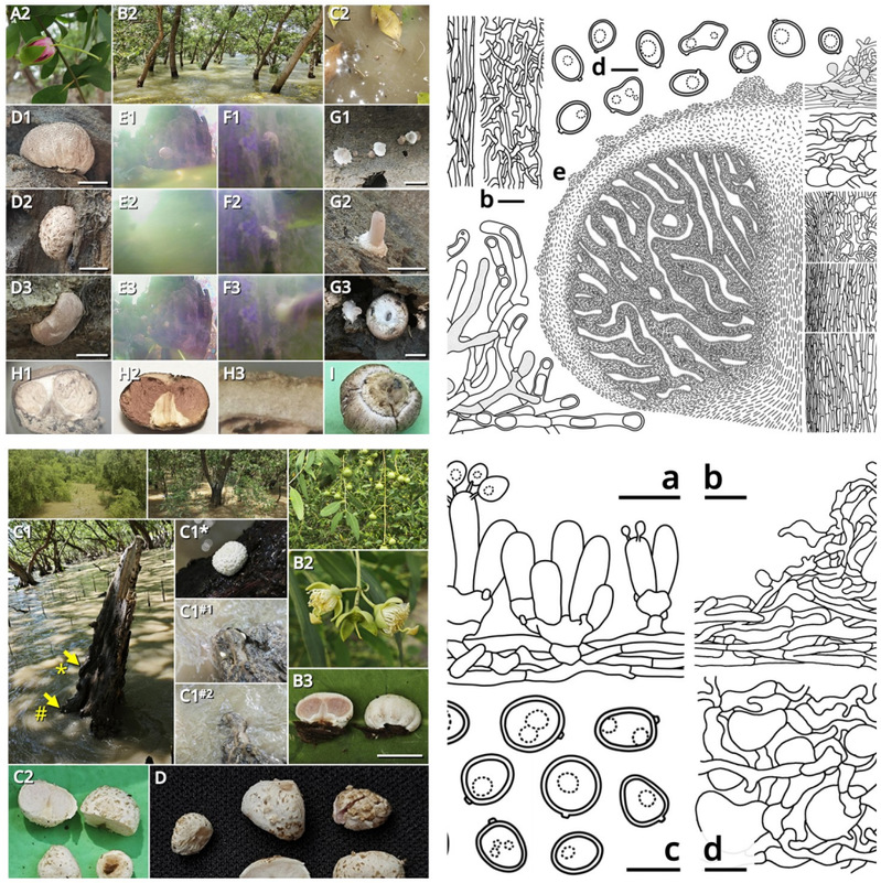 海洋真菌迄今报道了近两千个物种,但其绝大多数是肉眼不可见的小型真菌。以往的研究认为,具有产“蘑菇”(大型、肉质、近似伞形的担子果)潜力的海洋担子菌是一个十分稀少的类群,其中确认专性的成员主要位于尼亚马勃科(Niaceae)和膨瑚菌科(Physalariaceae)。它们受制于长期或间歇性被海水浸没的环境,即使肉眼可见也只形成极微小(通常不超过2 mm)的腹菌状、挂钟菌状或不规则的退化担子果,而属于伞菌类群的成员还从未被发现。