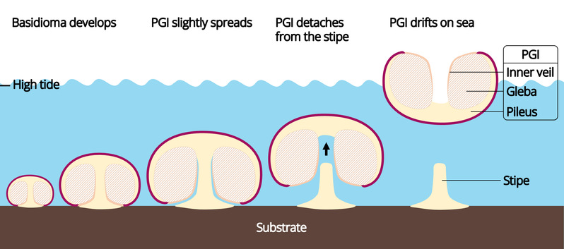 本研究中,作者在广东省深圳市西湾红树林和广州市海鸥岛红树林中发现了具有显著的近球形腹菌化伞菌状担子果的海洋真菌,对采集的40余标本进行了形态学观察和分子标记测序,通过系统发育分析识别出位于小脆柄菇科、堪多脆柄菇属的两个新种,分别命名为褐果漂泊堪多脆柄菇Candolleomyces brunneovagabundus Kun L. Yang, Jia Y. Lin & Zhu L. Yang 2023和白果漂泊堪多脆柄菇Candolleomyces albovagabundus Kun L. Yang, Jia Y. Lin & Zhu L. Yang 2023。通过显微解剖观察揭示PGI复合体脱落的内因是菌盖-菌柄过渡区紊乱而疏松的菌丝组织。将两个物种的孢子悬液分别接种于蒸馏水和海水PDA培养基进行对比培养,发现它们在后者中的生活力显著更高,很可能已经专性地适应了海洋环境。这两个物种以其直径可达1.7 cm的腹菌化伞菌状担子果、喜盐的习性和特化的孢子传播机制成为了已知唯有的两例贴切传统“蘑菇”概念(大型、肉质、近似伞形的担子果)的海洋真菌,刷新了对海洋真菌多样性的认知。它们的发现为开发海洋真菌食品、药物和生物能源等提供了新资源,还挑战了以往研究中对海洋担子菌只产生极微小担子果的预判,暗示着海洋环境中可能有更多未被认知的大型真菌。