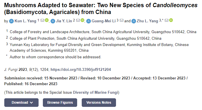 近日,我院2022级森林保护1班的本科生杨坤龙同学在国际菌物学期刊《Journal of Fungi》在线发表了题为“Mushrooms Adapted to Seawater: Two New Species of Candolleomyces (Basidiomycota, Agaricales) from China”的研究论文,报道了来自广东省红树林中的两个海洋蘑菇新种。
