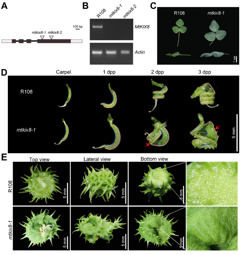 虽然有管螺旋果荚的形态学研究已有报道,但相关的遗传机理还并不清楚。蒺藜苜蓿(Medicago trunctula)是豆科模式植物,具有天然的螺旋状果荚,是研究植物器官螺旋的理想材料。近日,国际经典植物学杂志Plant Physiology在线发表了华南农业大学葛良法教授/黄巍教授团队题为“KINASE-INDUCIBLE DOMAIN INTERACTING 8 regulates helical pod morphology in Medicago truncatula”的研究论文。研究者在筛选与器官大小调控因子BIG SEEDS 1 (BS1)互作蛋白的过程中,得到一个与BS1互作的转录因子MtKIX8。MtKIX8是拟南芥AtKIX8/9、番茄SlKIX8/9、大豆GmKIX8/9、豌豆PsBIO以及百脉根LjBIO的同源基因。该基因广泛参与了被子植物器官大小及花瓣内部不对成性的发育调控。研究者在蒺藜苜蓿突变体库中筛选到了两个mtkix8等位突变体,其果荚在发育过程中,不能形成规则且致密的螺旋状结构,手性也会发生改变。通过组织细胞学研究,研究者发现mtkix8突变体果荚腹缝线区域的细胞数目、形态及大小均存发生了明显改变。进一步的研究表明,MtKIX8在果荚腹缝线区域的表达显著高于背缝线区域,并通过协调腹缝线和背缝线区域的生长速率决定果荚的最终形态。本研究不仅发现了MtKIX8的新功能,也揭示了苜蓿属螺旋果荚形成的机理模型。