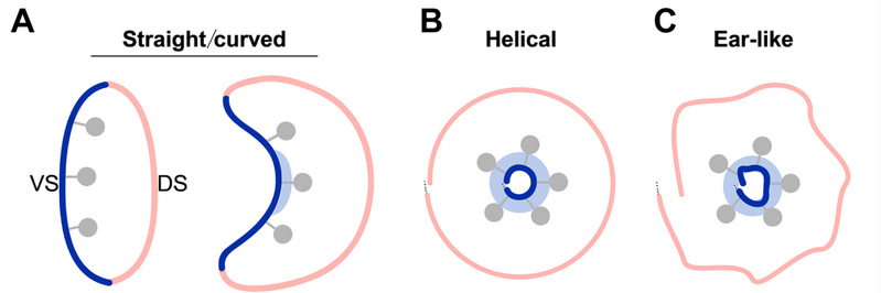 荚果是由单心皮发育形成的果实,也是豆科植物所特有的果实,能起到保护种子的作用。在长期进化的过程中,荚果演化出了多种形态的,以适应不同的种子传播机制。根据形态特征,果荚可大致分为三类,即直型果荚、螺旋果荚和扭曲果荚。当果荚的腹缝线和背缝线的生长速率相对一致时,果荚表现为直型(例如大豆);而当背缝线生长显著快于腹缝线区域时,果荚弯曲生长,呈现螺旋果荚形态。这两种果荚形态存在于大部分豆科植物中。若螺旋果荚的背缝线或腹缝线的生长速率比例严重失调,果荚无法沿着同一个手性方向螺旋生长,就会呈现扭曲的异常螺旋,称为扭曲果荚(ear-like)。这种果荚主要存在于大叶相思(Acacia auriculaeformis)、象耳豆(Enterolobium cyclocarpum)等含羞草分支(mimosoid clade)植物中。