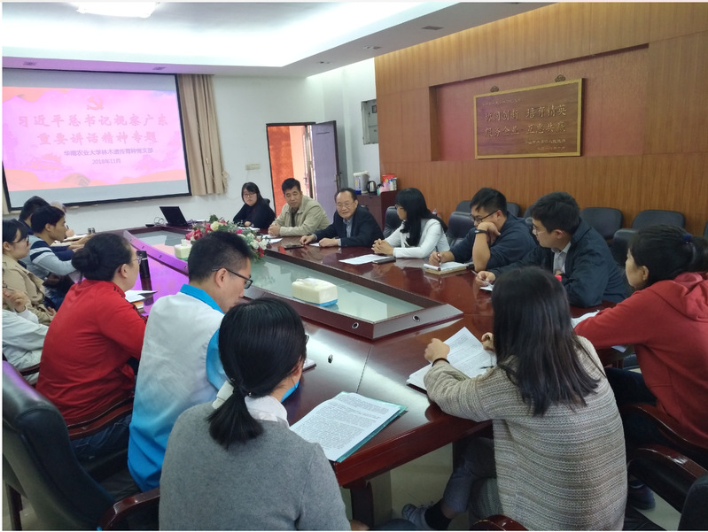 2018年11月26日,林木遗传育种教研室党支部在学院620召开党组织生活会,会议主题为深入学习贯彻习近平总书记视察广东重要讲话精神。陈晓阳校长出席了这次会议。