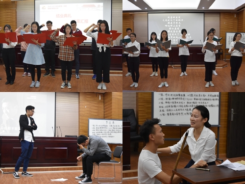 随后,党员发展对象培训班的六个小组轮番进行了党课结业成果汇报及风采展示。各小组的汇报演出精彩纷呈,无论是演唱,诗歌朗诵或是表演,从侧面反映了一名合格党员应该具备的党性修养和政治觉悟,令人喝彩过后又感触颇深、不禁再次细细品味。演出中最令人印象深刻的无疑是第五小组。他们通过精妙的演技极富感染力地呈现了《人民的名义》的部分情景,凸显了“反腐永远在路上”的启示。