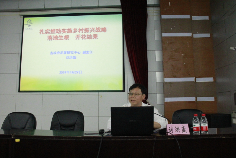最后,结合习近平总书记视察广东重要讲话精神和自身调研掌握的广东省实际情况,刘洪盛用诸多真实案例,着重介绍了广东推动实施乡村振兴战略的重点及硬任务:补短板、强弱项,聚焦硬任务集中发力。他强调,广东省的乡村发展水平相较于全国平均水平和东部其他兄弟省份都较为落后,在推进乡村振兴战略的进程中要围绕加强农村基层党组织对乡村振兴的全面领导、决战决胜脱贫攻坚、实施“千村示范、万村整治”工程、大力发展富民兴村产业、加快补齐基础设施和公共服务短板、健全促进城乡融合发展体制机制、强化乡村振兴保障机制等七个硬任务,结合广东特色,发扬“敢闯、敢试、敢为人先”的改革精神,加快推进乡村振兴战略,为国家实现“两个一百年”奋斗目标贡献力量。