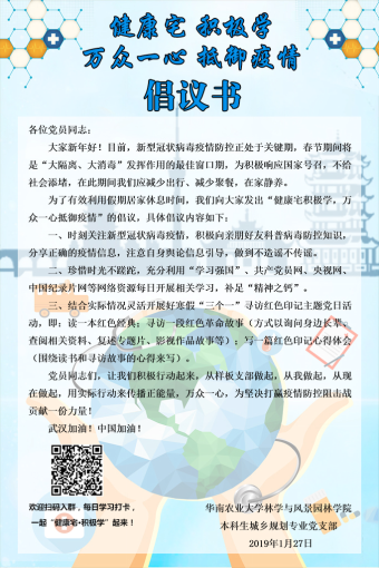 春节期间,正是新型冠状病毒疫情防控的关键期,为积极效应国家号召,在春节期间减少出行、聚餐,做好居家隔离的防控。59859cc威尼斯官网本科生城乡规划党支部于1月27日向全体党员发起了“健康宅积极学,万众一心抵御疫情”的倡议。倡议内容如下: