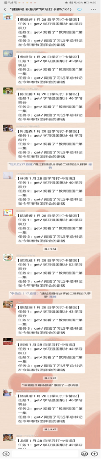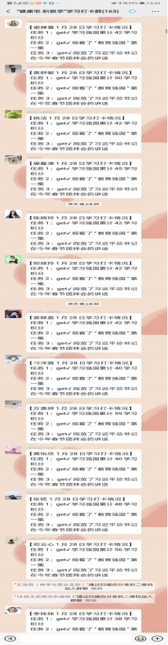 该学习打卡群自1月28日设立起,每天晚上20点左右,群内就会开始接龙打卡,大家都自觉地汇报自己当天的学习情况。据统计,截止2月10日晚,一共有1436人次参与了学习打卡。学习强国的阅读积分累计超过58800。