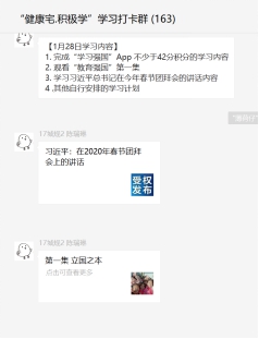 在这个学习群里每天发布的学习内容十分丰富,除了每天的规定动作“学习强国”APP的打卡学习之外,还有专题片观看、习近平总书记重要讲话学习、传统诗词学习等。同时,有关于疫情防控的最新资讯也会第一时间在群内发布。
