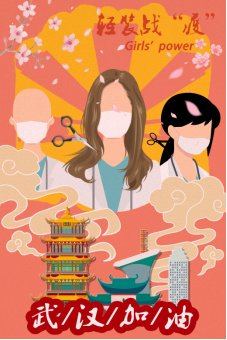 海报展现了身处疫情前线的女性医护人员,为了方便打理,她们剪短了自己心爱的头发,轻装战“疫”,奔赴前线,她们在奋力抗疫中迸出了强大女性力量,用实际行动为武汉加油!为中国加油。