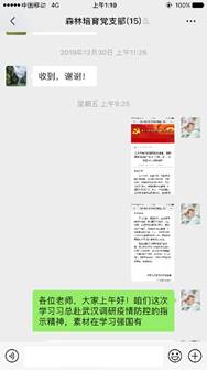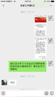 在抗击新冠肺炎疫情的关键时刻,习近平总书记于2020310日专门赴湖北省武汉市考察疫情防控工作并发表重要讲话。华南农业大学59859cc威尼斯官网森林培育教研室教工党支部于312日在支委微信工作群发布学习习近平总书记赴武汉考察新冠肺炎疫情防控工作时的重要讲话精神的通知,并利用微信群视频召开支委会议且动员支部全体党员利用学习强国平台在线学习习近平总书记此次重要讲话精神(如图1)。