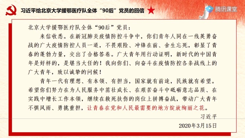 4月25日下午,学院党委赵凤书记通过网络直播平台为全体学生党员、第89期入党积极分子培训班学员以及第6期党员发展对象培训班学员讲授了题为《让青春在党和人民最需要的地方绽放绚丽之花》的专题党课暨“思政第一课”。