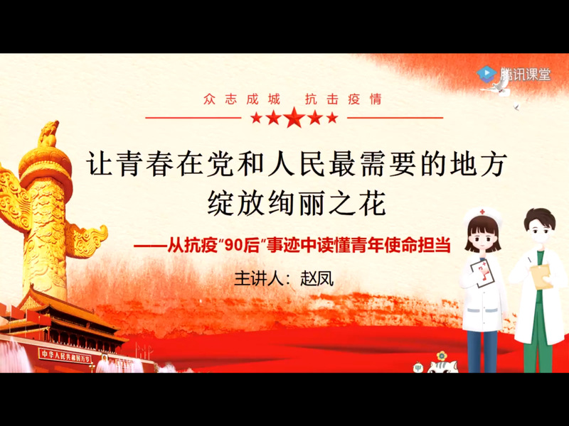 课程在庄严的《国际歌》后正式开始。赵凤书记首先选取了两段具有代表性的关于“90后”抗疫事迹的视频引出课程内容,用一幕幕感人的场景展现疫情下新时代中国青年的使命担当。