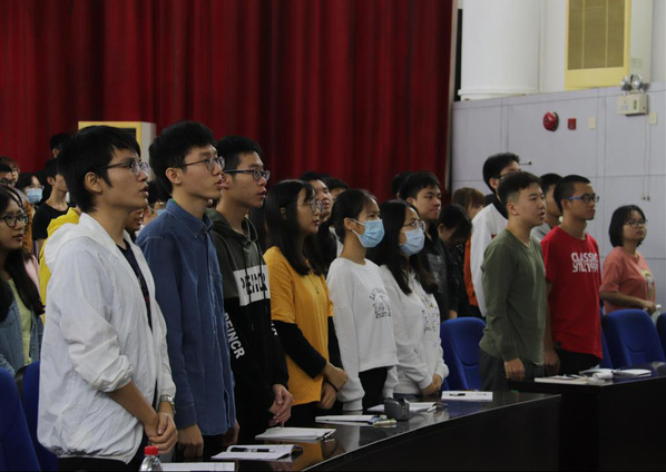 国际歌奏唱结束后,陈教授引用党的十九大报告中的内容,向学员们强调,中国特色社会主义进入新时代,我们党一定要有新气象新作为、努力实现伟大梦想、建设新的伟大工程。接着,陈教授从三个方面进行论述:一是新时代党的建设面临的新形势新任务;二是新时期党的建设的总要求和战略部署;三是青年党员思想建设的首要任务。