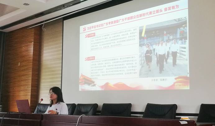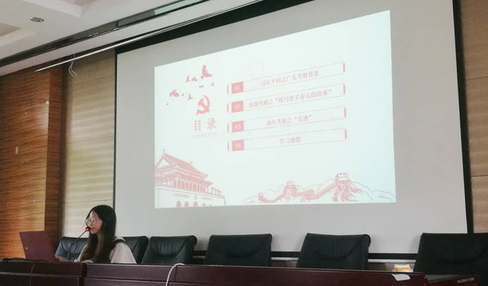 第一党小组的党员代表带大家回顾了习近平总书记广东考察行的重点,介绍了在深圳、潮州等地提出的发展目标,结合自身学习和经历总结作为在校大学生党员应不断加强自身的党性修养,紧跟时代要求不断学习进步,面对广东的未来发展趋势要有准确地把握。