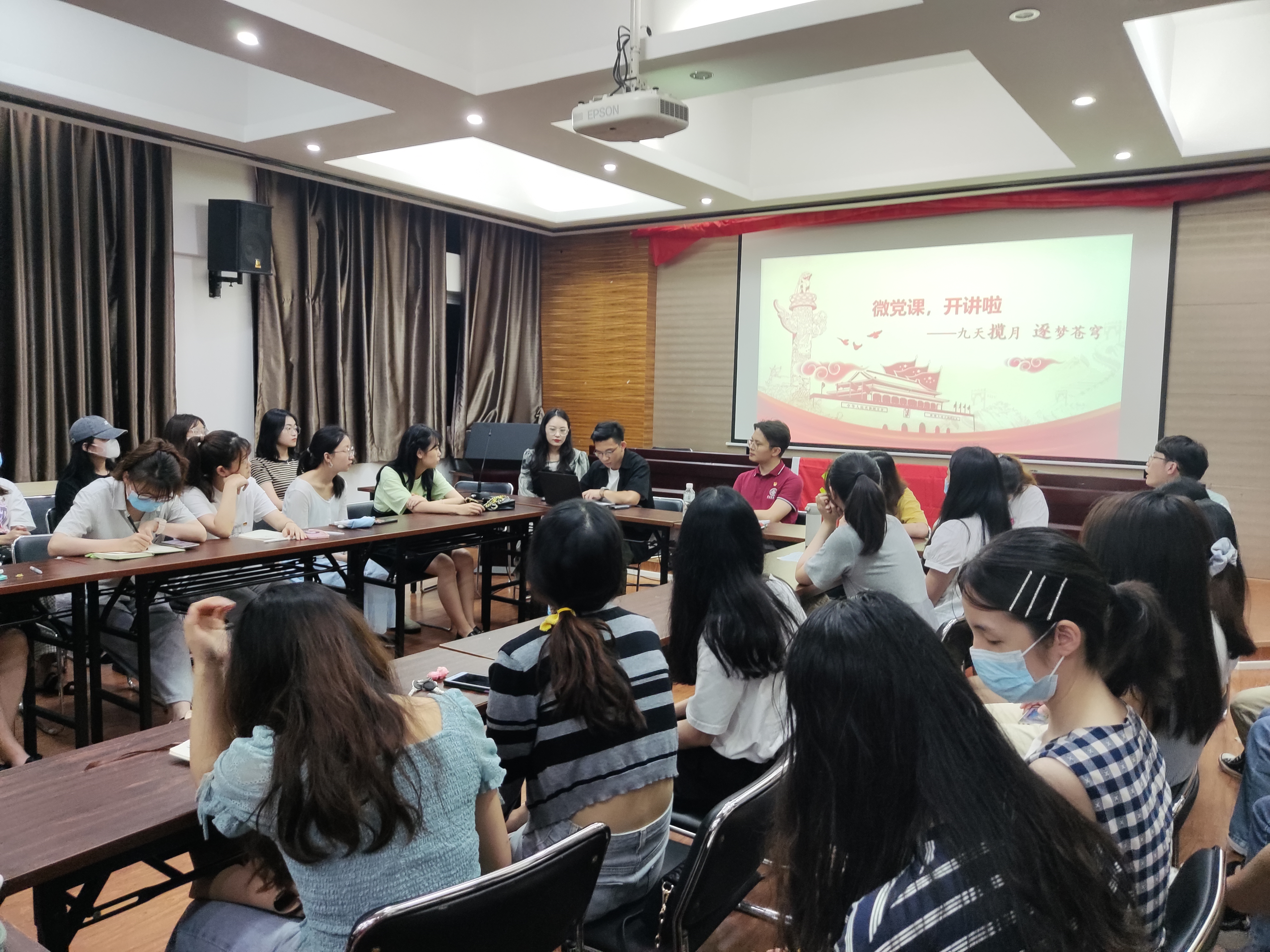 会议的第三环节是“微党课,开讲啦”。支部党员代表2021级博士梁京威同志以“九天揽月,逐梦苍穹”为主题,阐述了中国人自古以来对月的探索,从“东方红一号”,“长征一号”到“神舟”载人航天;“嫦娥”探月工程;近年来的“天问”行星探测,中国航天梦从未磨灭,载人飞船叫“神舟”,探月工程叫“嫦娥”,月球车叫“玉兔”,“玉兔”在月球上跑的那圈地叫“广寒宫”,行星探测任务叫“天问”,火星车叫“祝融”,载人空间站叫“天宫”,卫星导航系统叫“北斗”,暗物质粒子探测卫星叫“悟空”,这是属于中国人航天的浪漫。