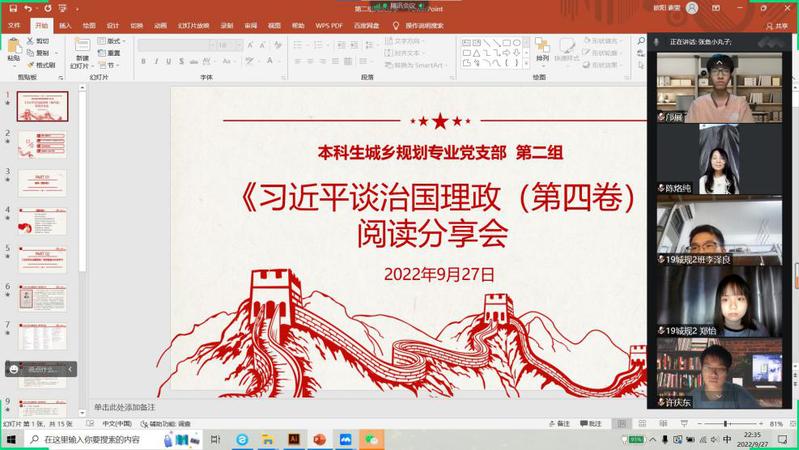 为深入学习贯彻习近平新时代中国特色社会主义思想,9月26-29日,本科生城乡规划专业党支部以“深读细悟《习近平谈治国理政》第四卷,谱写新时代答卷”为主题开展了一次读书分享会。本次读书分享会由各个党小组分别组织进行,分别为线上和线下两种组织形式。各个党小组积极响应,通过线上腾讯会议学习、线下集中交流分享等形式开展活动。