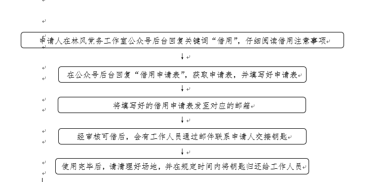 4、交接钥匙:经审批同意借用后,工作人员会联系借用人在指定时间地点交接钥匙,拿到钥匙后要负责保管好;使用完毕后需在规定时间内归还钥匙。